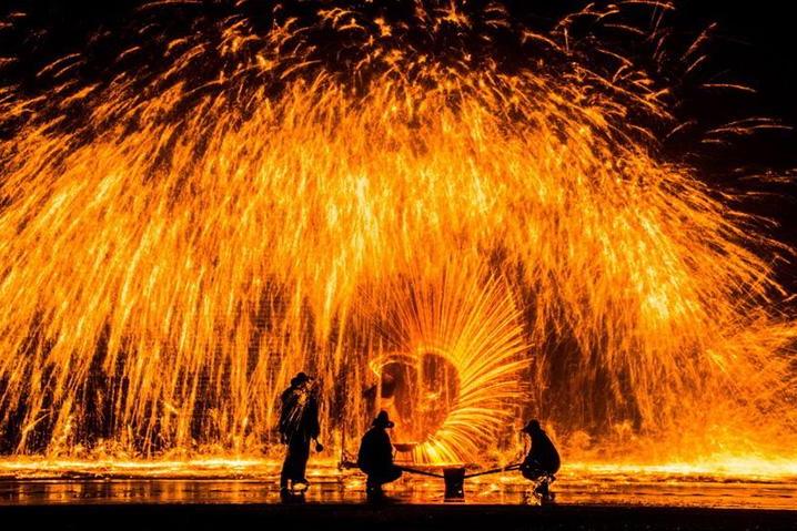当一勺勺铁水化作千朵万朵火花,从夜空中飘飘洒洒、缓缓落下时,它给观众带来的既有瞬间感官上的刺激,更有心灵深处的震撼。将数百公斤重的生铁用炼炉烧化成铁水,再用特制的勺子舀起,均匀地洒向天空,火红的铁水化作条条丝线,纷纷扬扬洒落下来,铺天盖地,其壮观、其璀璨,在中国成百上千灯节风俗中,独一无二。