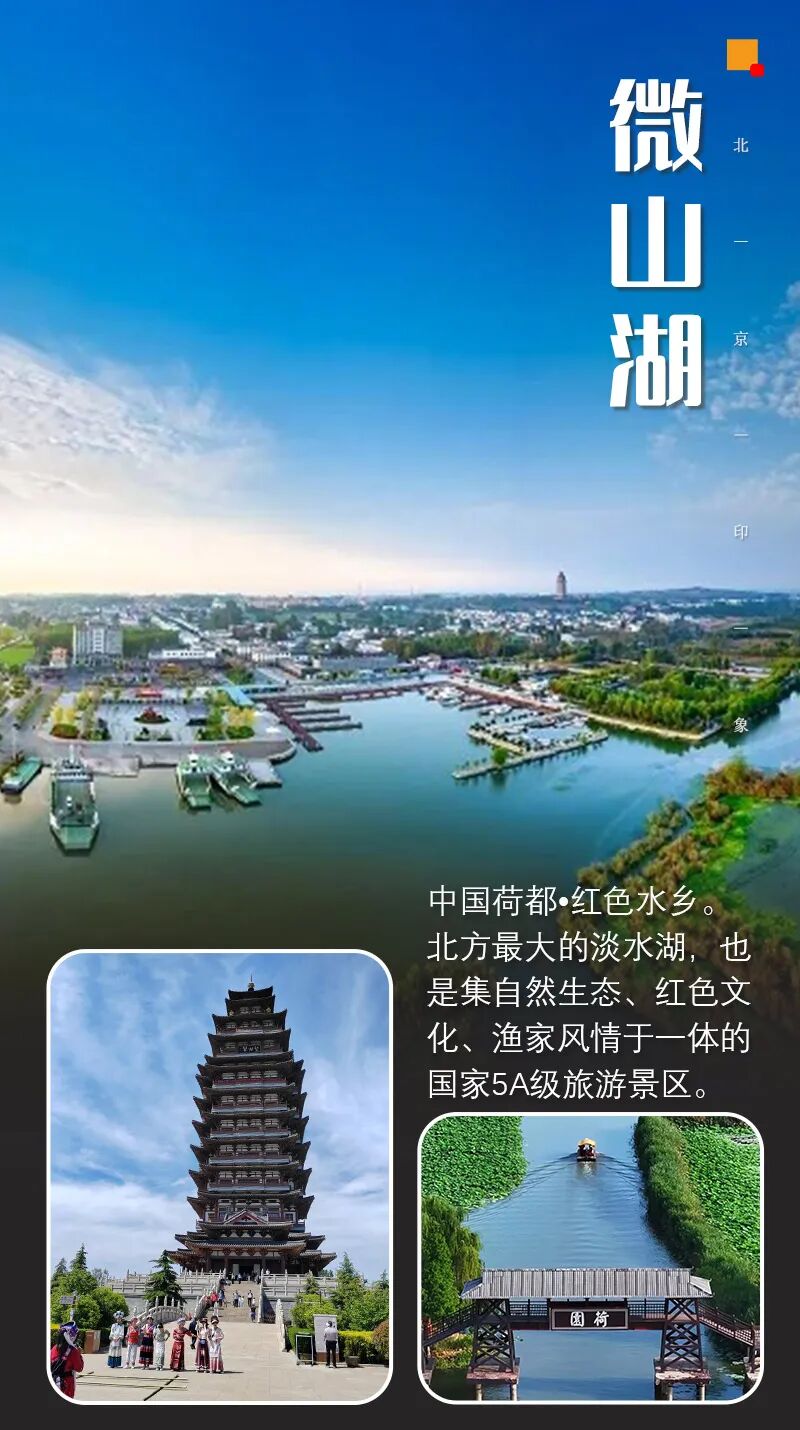 - 景区概况:前往国家AAAAA级风景区【微山湖旅游区】位于山东省微山县境内,京杭大运河纵贯南北。是我国北方最大的淡水湖微山湖,微山湖旅游区历史悠久,文化底蕴深厚。宋国始祖微子、汉代名相张良长眠于此。抗日战争期间,英勇的铁道游击队、微湖大队、运河支队等革命武装,凭借百里微山湖、千项芦苇荡,开展机动灵活的游击战争,开辟和保护了湖上秘密交通线,趟出通往延安的坦途,书写了荡气回肠的壮丽诗篇。抵达码头后车乘大型游船横穿京杭大运河,赴微山岛。登岛后游览红色旅游景点——【铁道游击队纪念园】,铁道游击队纪念碑、纪念馆,重温那抗日英烈的英勇事迹,聆听那段壮美激扬的英雄战歌参观【微子文化景区】,三仁殿、目夷君墓、望湖塔,乘观光电梯登高远眺,微山湖全景尽收眼底,浏览【微山湖荷园】后参观——【渔家民俗博物馆】,充分了解湖上人民的生存捕鱼方式,