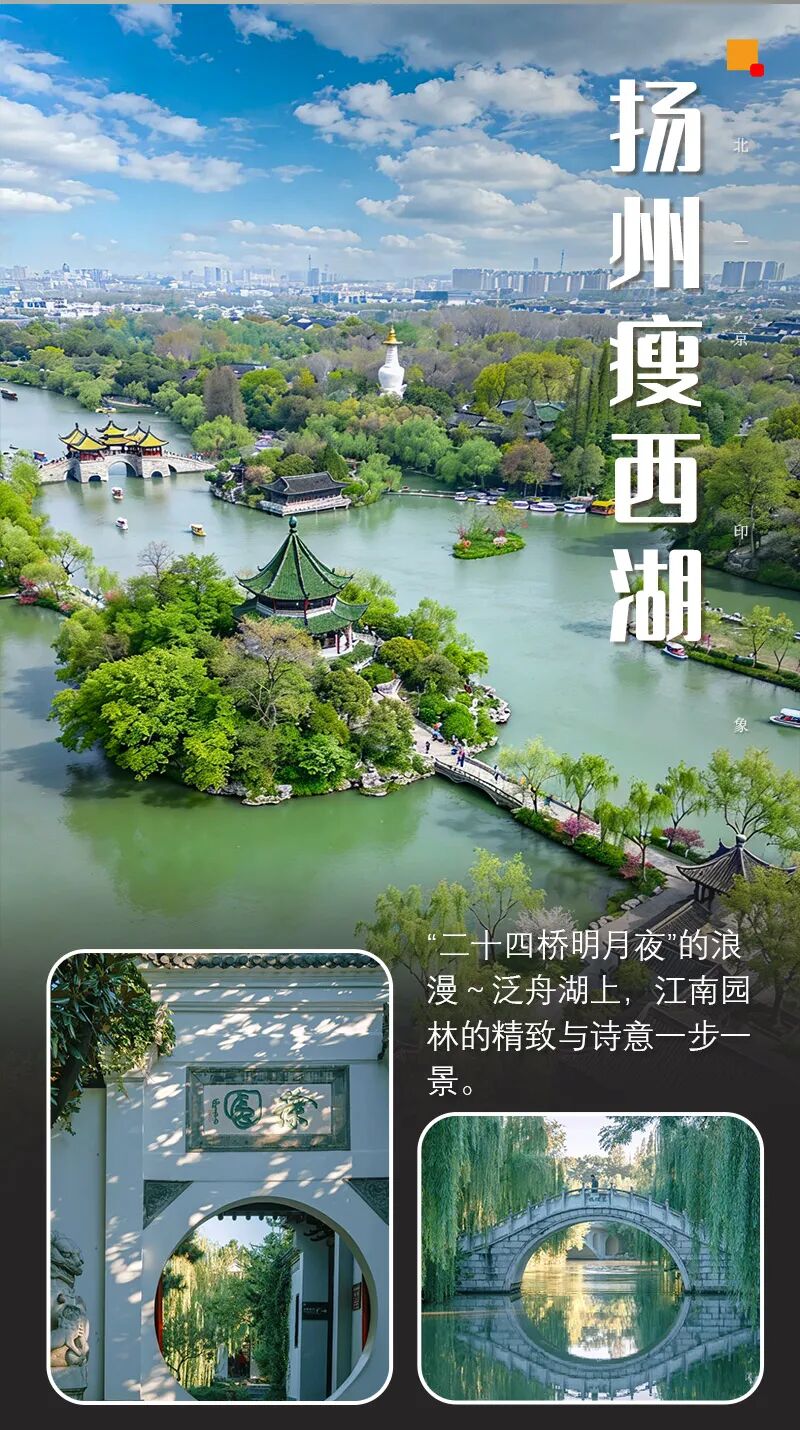 早餐后前往瘦西湖游览:扬州瘦西湖(湖上园林·5A·世界遗产)“两岸花柳全依水,一路楼台直到山”,五亭桥、白塔、二十四桥、钓鱼台核心地标。