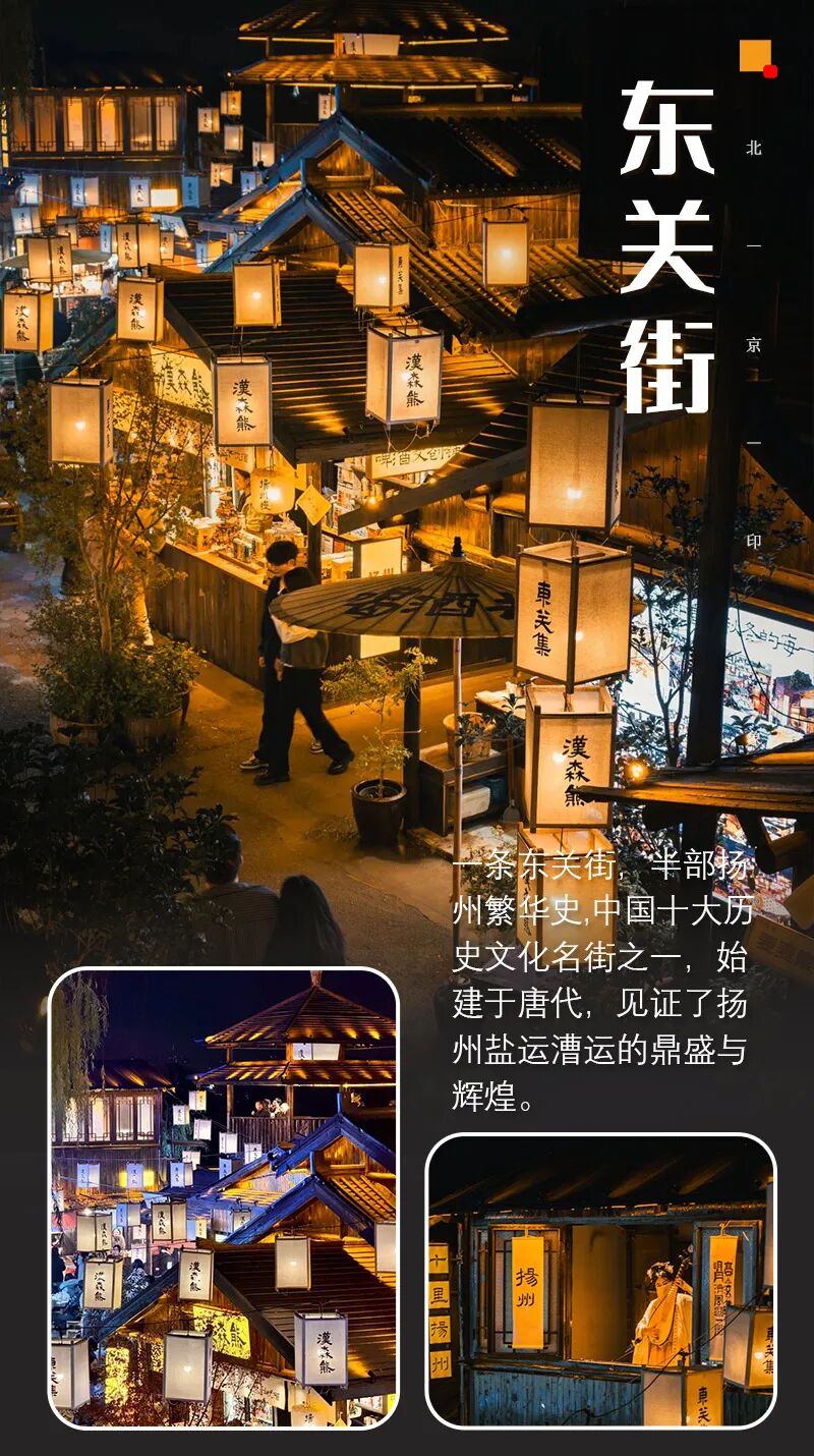 - 景区概况:扬州千年古街,青石板路、老字号、非遗、小吃聚集,直通古运河 。