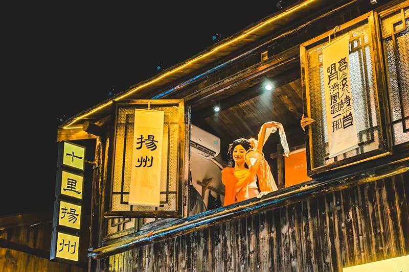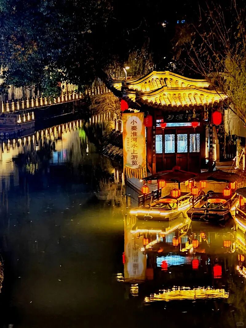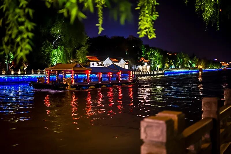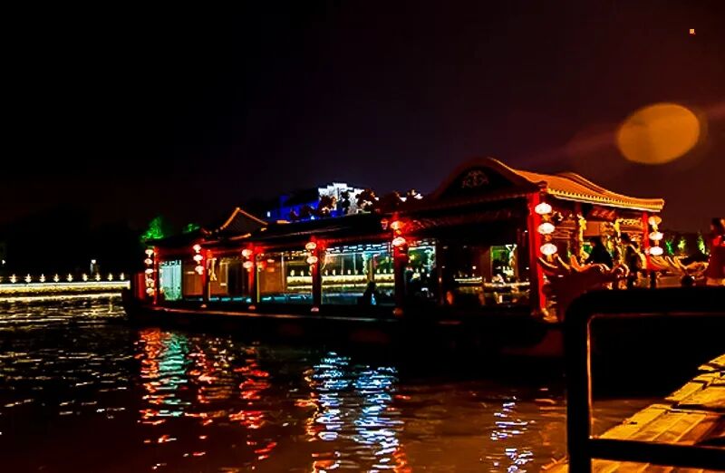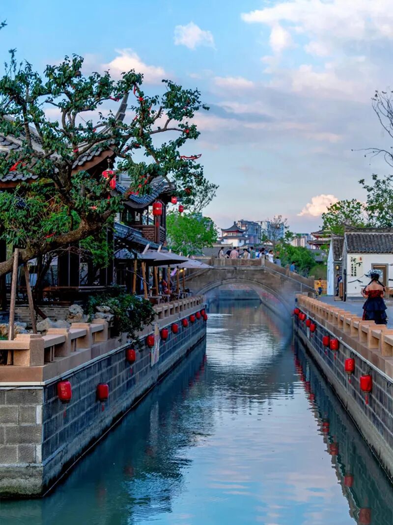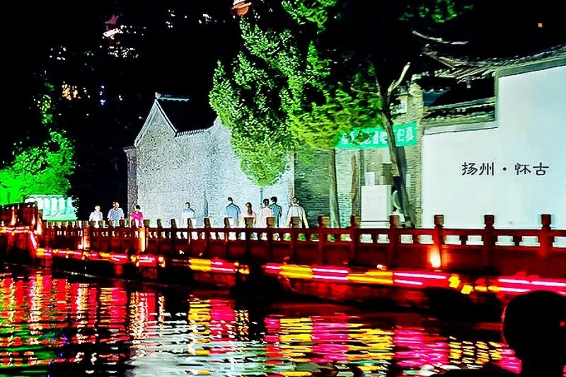夜景灯笼亮起,古风氛围感拉满,适合汉服拍照。随后顺序游玩旁边的古运河,夜色下的古运河在灯光的照耀下显得那么安详、宁静,看着风景真的是不错的选择!古运河扬州段是整个运河中最古老的一段。这一段运河最为古老,可谓历史遗迹星列、人文景观众多。