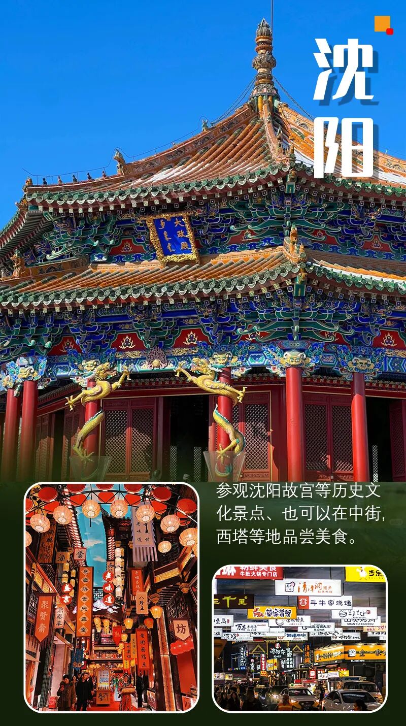 - 早上可以早起游览沈阳市内景点,如小河沿早市、太清宫、沈阳故宫、沈阳中街等;不想起的酒店继续睡到自然醒。